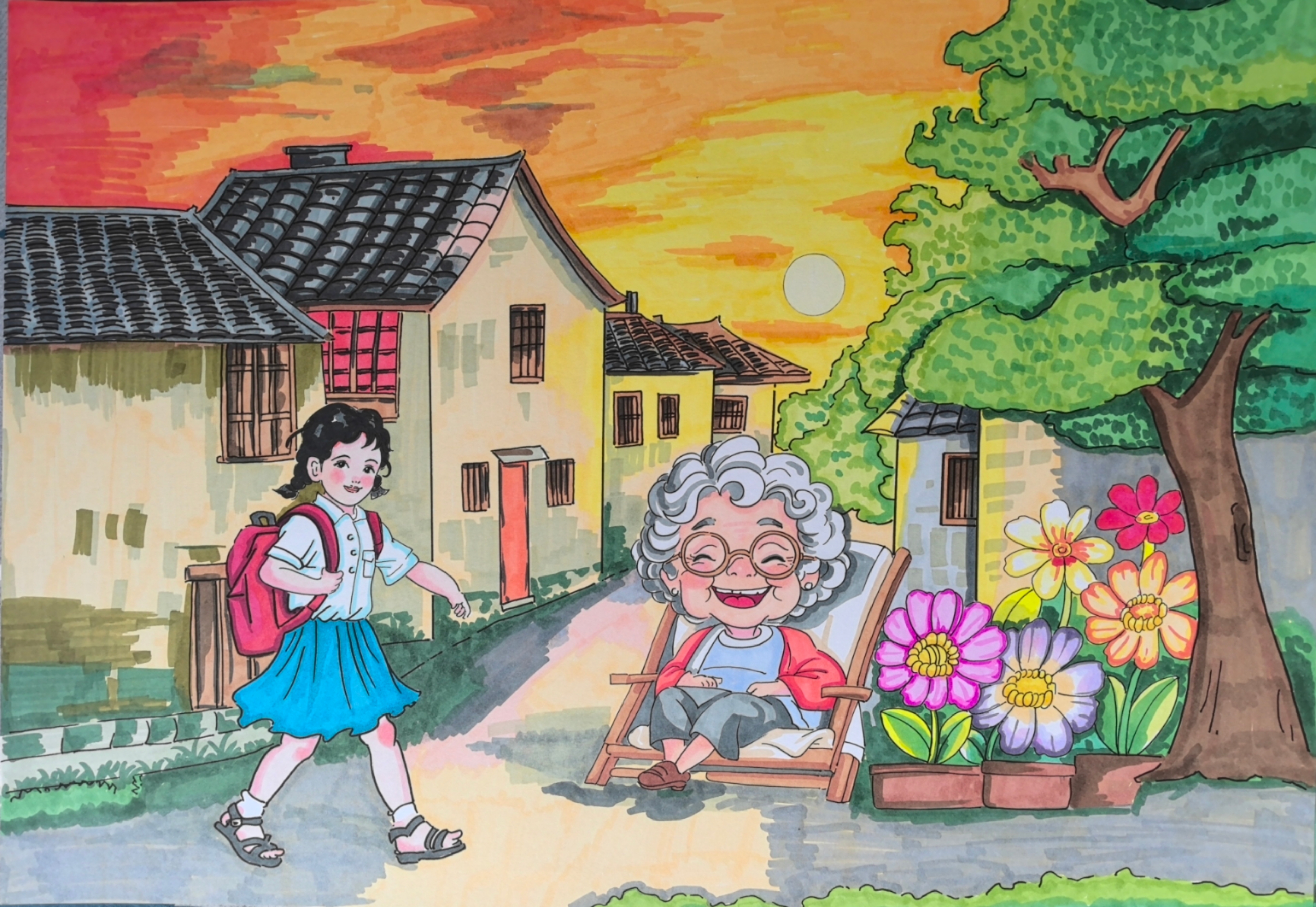 夏日傍晚,老奶奶在屋前摇着蒲扇,赶走余热,小朋友开开心心背着书包出去玩耍,傍晚的夏日非常凉爽,小女孩和老奶奶开心的打招呼,快乐的奔向前方。。。 安徽省图书馆